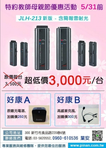 公告訊息:*福利訊息*上課好幫手-無線麥克風特惠價 1764 次閱讀 無線麥克風老師上課的好幫手,讓您輕鬆優雅的講課!各家網路價3400~3600元,教師會特約商店優惠價3000元!JLH-213新版-含簡報雷射光洽0960-610536葉安詳看附檔