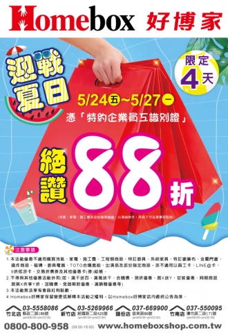【Homebox 好博家】5/24(五)~5/27(一) 迎戰夏日˙絕讚88折