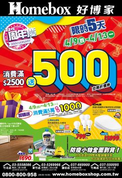 公告訊息:*福利訊息*【Homebox 好博家】22周年慶!! 4/9~4/13買2500送500折價券,歡迎貴賓到店參觀選購!