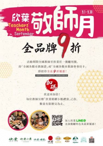 欣意一:教師9月份至欣葉任一品牌餐廳用餐,即招待全桌9折優惠