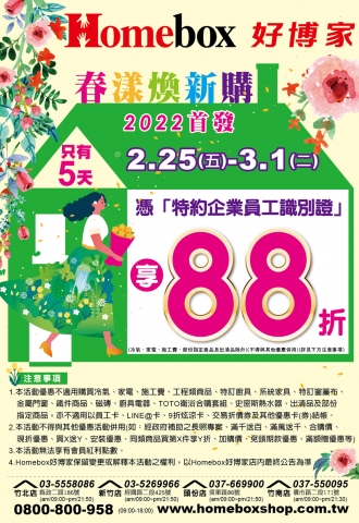 公告訊息:*福利訊息*【Homebox 好博家】2022首發!! 2/25~3/1春漾煥新購88折活動 即將開跑囉!