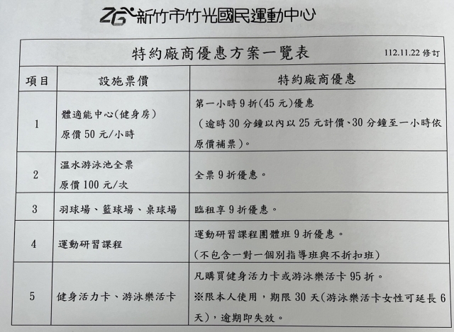 :113竹光國民運動中心特約優惠